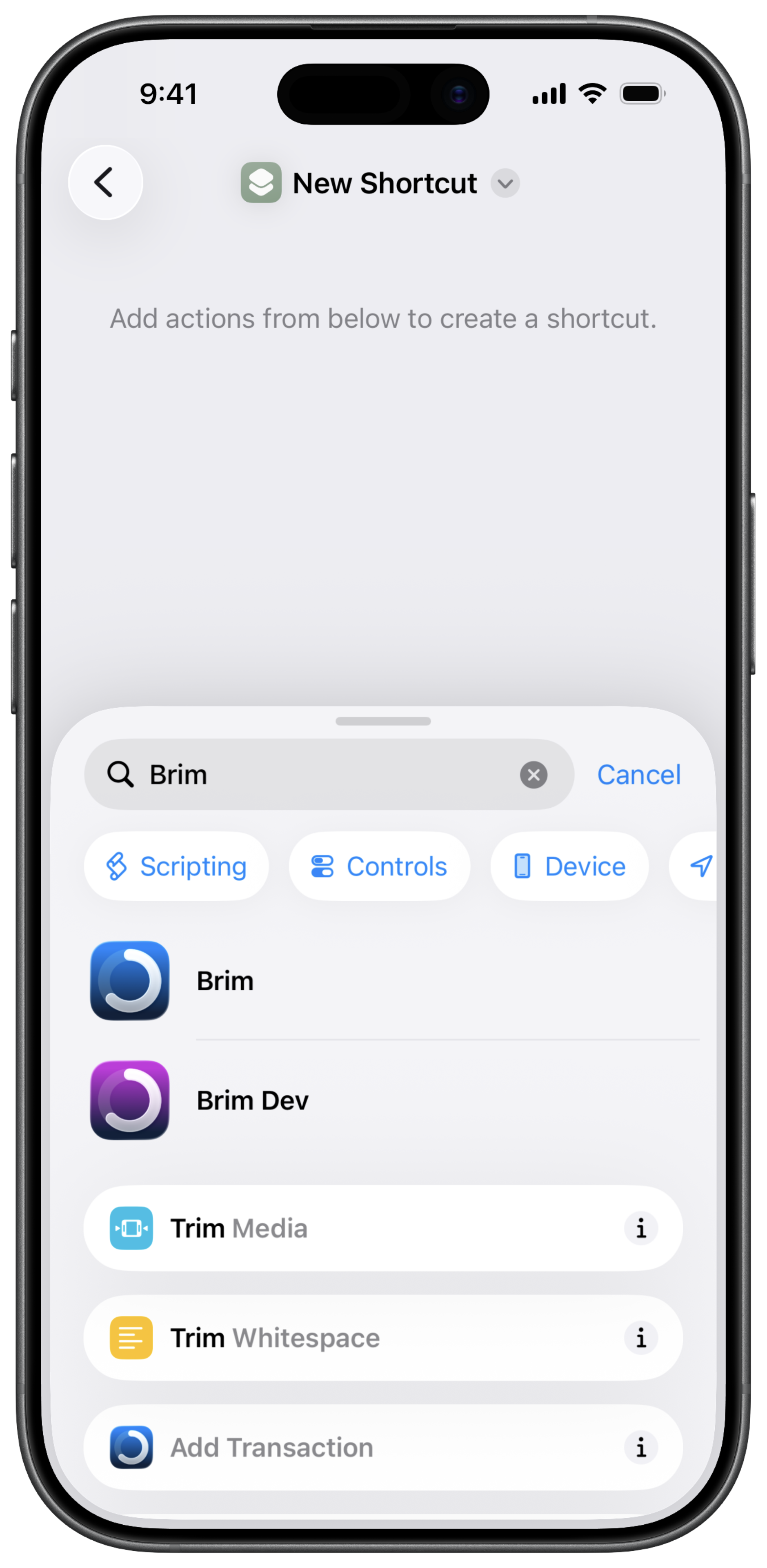 Tap on Brim in the results, then select Add Transaction. This is the action we’re going to configure.